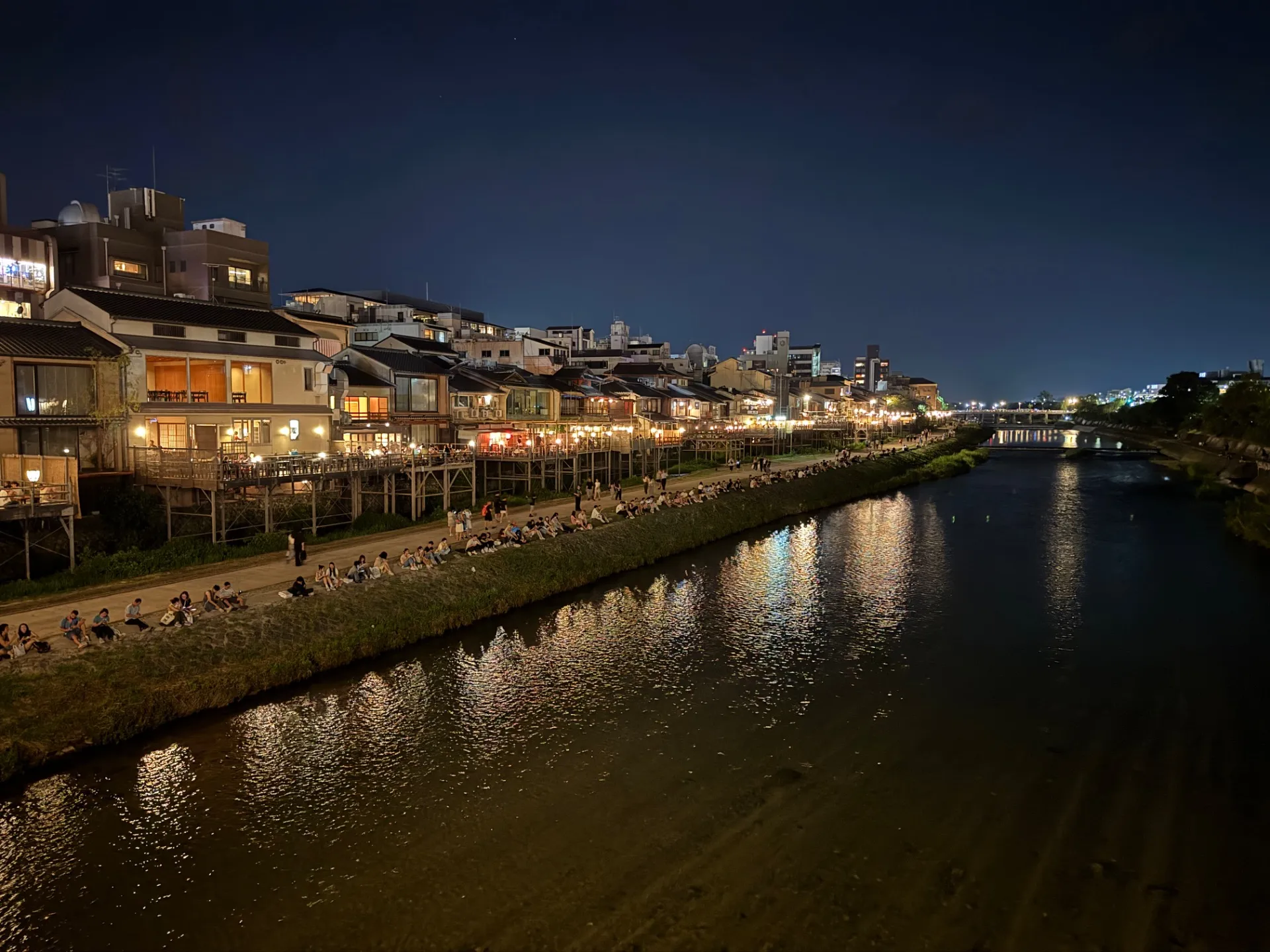 京都は観光客が多い中、昼と夜に素行調査をやりますと、顕著な変化がここ最近は見られます。それは、明らかに昼より夜の方が人手が多いということです。鴨川の等間隔カップルも昼は全く無し、夜はすごく狭い間隔の等間隔で座ってます。笑